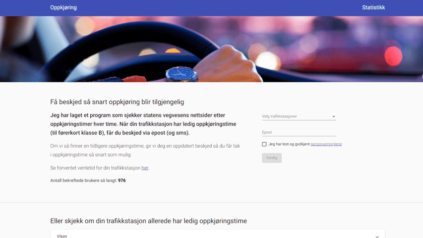 I made a program that checks the road administration’s website for available driver’s license test sessions to help people get their driver’s licenses. In Norway, it is really difficult to get your driver’s license test because there rarely are available sessions. However, with oppkjoring.com, anyone can sign up to receive mail and SMS as soon as a session becomes available. If you have technical questions about how I got this to work, please don’t hesitate in contacting me and I will tell you all about it.